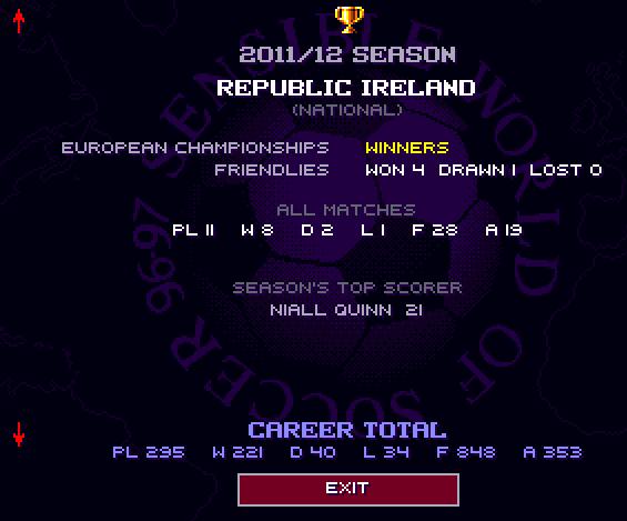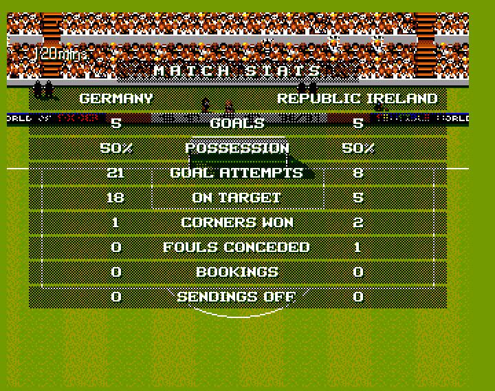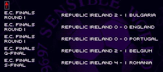 0 Scotland vs Ireland 0 despite the score line this was a great game Scotland missed the target several times i pounded the scottish goal but andy goram just saved everything i threw at him!!!! I cant ever remember him being that good in swos!!