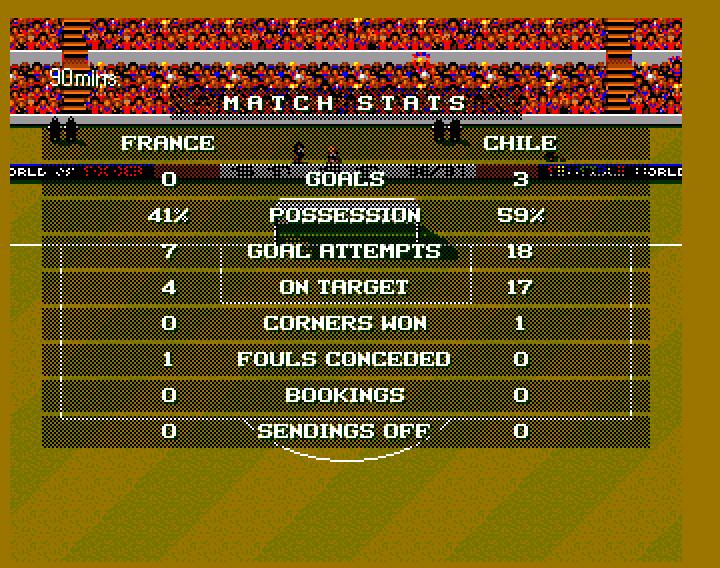 2nd half i raised my game beyond believe brazil had 2 shots on goal as i ran amock firing anything i could at the brazilians i didnt let them have a sniff of the ball! again shot after shot after shot was saved or defended then in the 88th minute a beautiful ball was played through to zamorano who this time was away from his marker and tucked the ball in the top right corner with class! Another game that goes down as one of the best i ever played in!!!