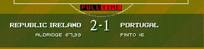 Great final! Both sides came out all guns blazing portugal had screaming shots go left right and even hit the bar a great piece of defending by phil babb off the line from a rasp by pinto was one of the highlights of the game! Pinto struck in the 16th with a punishing strike from a defensive error outside the box. Same great play by both sides in the second half Pinto causing all kinds of problems for Irish defence but they managed with grit and determination to keep him at bay a long ball to aldridge got the Irish back in to the game with a 67th minute strike from just outside the box. More of the same until the end of normal time but noone could break the deadlock. Extra time shots came from both sides fast and furious you could flip a coin as to who would win it then in the 99th minute aldridge ran and did a nice 1-2 with coyle and slotted the ball in the corner! Great defending for the rest of the game from ireland prevented portugal from equalising and gave them the cup a fine game!!!