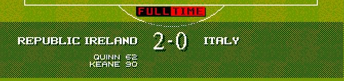 0 Italy vs Ireland 2 even game a header by quinn followed by a 90th minute round the keeper tap in by keane secured the win italy just couldnt score