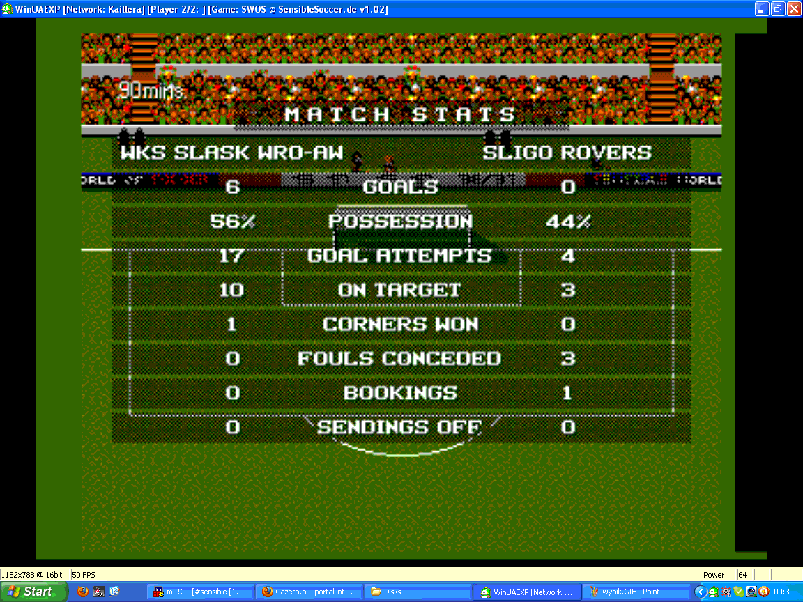 Pierwsza minuta ustawila mecz. W polu karnym (?) teatralnie padl napastnik gospodarzy i sedzia wskazal na wapno. Powtorka dobitnie wskazala, ze napastnik wbiegl na obronce robiacego wslizg, ale nie zmienilo to faktu, ze podlamalo to gosci. Tym bardziej, ze stroje obu druzyn roznily sie nieznacznie i w ogolnym chaosie dosc ciezko sie gralo. Pare minut pozniej bylo 2-0 kiedy wlasnie po zamieszaniu koszulkowym w obronie pilke do bramki znow wpakowali gospodarze. Kolejne bramki po skladnych akcjach byly tylko kwestia czasu. Do przerwy 5-0 i po meczu. W drugiej polowie gospodarze dolozyli kolejna bramke, a zrezygnowani goscie nawet raz nie zagrozili bramce przeciwnikow.