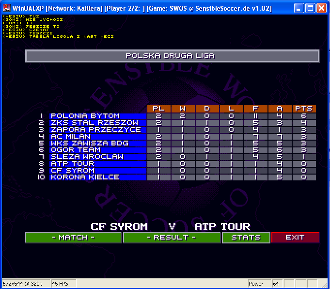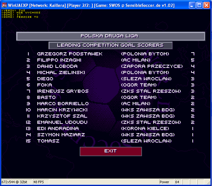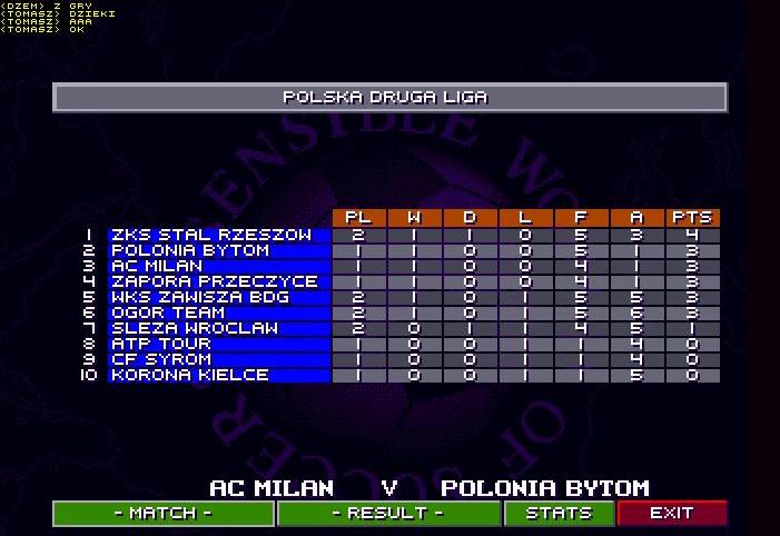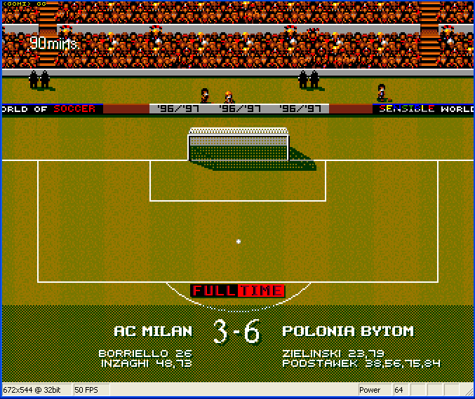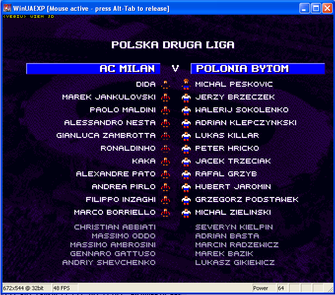 Właśnie zakończył się mecz AC Milan - Polonia Bytom. Pierwsze minuty to była gra błędów z obu stron i wzajemne poznawanie rywala. Już na początku meczu sfaulowany został Pato i musiał opuścić boisko na noszach. Gracze z Mediolanu za bardzo się zdekoncentrowali po utracie swojego rozgrywającego i jako pierwsi popełnili błąd w obronie. Strzelcem gola był Zieliński, który wpakował piłkę do pustej bramki po świetnym podaniu Podstawka. Włosi niczym internetowi mistrzowie ciętej riposty wyrównali po 3 minutach stan meczu za sprawą Boriello. Otrzymał on mocne podanie, dzięki któremu zgubił jednego z obrońców i podkręconym strzałem obok słupka nie dał szans Peskovicowi. Wiele błędów włoskiej obrony uchodziło na sucho, niestety do 38 minuty. Podstawek strzela gola w końcówce 1szej połowy i to gracze pod wodzą Gomiego schodzą z uśmiechem do szatni. Trener Yesiu starał się zmotywować swoich graczy do walki co częściowo mu się udało, gdyż Inzaghi wyrównał stan meczu w 48 minucie i przywrócił nadzieję kibicom rossoneri na korzystny wynik. Jednak tego dnia będący w gazie Podstawek znów wytyka błędy w zgraniu obrony Milanu i zdobywa bramkę w 56 minucie. Yesiu widząc postawę swoich graczy na boisku postanowił postawić wszystko na jedną kartę i zmienił ustawienie graczy ze stonowanego sweep na bardziej ofensywne 5-3-2. Mimo słabej obrony najjaśnieszym punktem Milanu był atak, gdzie brylowała para Inzaghi-Boriello, którzy się rozumieli bez słÃ³w. Dowodem tego była wyrównująca bramka na 3-3 tego pierwszego. Znów los nie okazał się łaskawy dla Włochów i kontuzję odniósł kluczowy gracz Boriello. Po tym wydarzeniu obraz gry drastycznie się zmienił. Widać było załamanie koncepcji gry i samych piłkarzy Milanu co skrzętnie wykorzystywała to para Podstawek-Zieliński. Zdecydowanie najlepszy na boisku był Podstawek, który pokazał Włochom jak się strzela z dystansu i pięknymi strzałami po przekątnej zdobył dwie bramki. Zieliński dodał swoje po trzeciej takiej samej akcji Podstawka, który puścił podkręconą piłkę tuż obok linii autu w stronę bramki. Napastnik Polonii Bytom przepchał się przez obronę Milanu i zdezorientowanego Didę i z najbliższej odległości strzelił gola głową. Po ostatnim gwizdku sędziego cała ławka rezerwowych rzuciła się na Podstawka, który podobno ma dostać niezłą premię po tym meczu