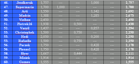 Na chwilę obecną surowe kary grożą takim zawodnikom, jak Patryksl, Defone, Michal, Ola, Kalasznikov, Bobbiebobras, Grabek, Lechita, Noel, Mati,Kaizen. Jedynie Primo jest usprawiedliwiony, bo zgłaszał awarię joya i w razie czego nie zostanie obciążony karami. Reszta towarzystwa jakieś mecze rozegrała i ewentualne rozstrzygnięcia w ich sprawie zapadną tuż po wyznaczonym terminie na rozegranie grup...