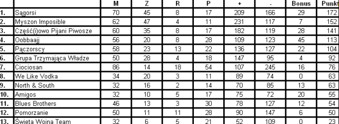 Tu macie rozpisane wszystkie drużyny i punkty w każdej kolejce. Proponuje ściągnąć i porównać z tym co jest na stronie 4ej.