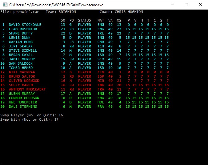 It originates from six years ago and will now run in any version of Windows from XP to Windows 10. On launching SWOSCARE it requests the full .CAR filename with extension. It then offers the choice of a squad display with either career details or skills. I attach three screenshots covering most of the options: