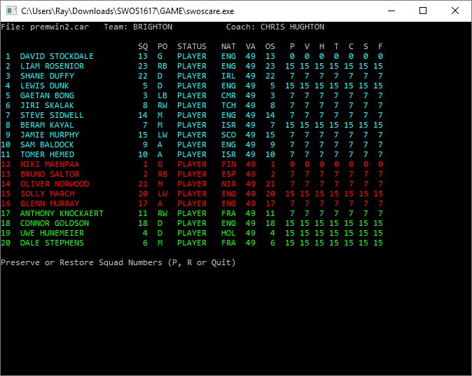 An updated SWOSCARE which will run on any version of Windows will have the facility to store the original squad numbers created in SWOES. This is done by utilising a byte for each player which is only currently used if the player name is the maximum length of 22 characters, which I will avoid. SWOSCARE can then reset players squad numbers at any time.