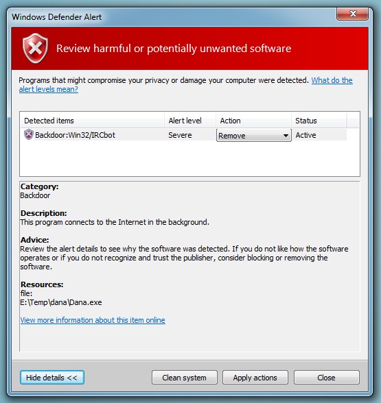 Hi.. I got a warning from Windows 7 telling me Dana IRC (dana.exe) is sort of backdoor virus.. True or a hoax? Could be another program listed with same name (dana.exe) that is listed as unwanted file.